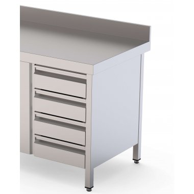 Características Técnicas • Módulo de cajones fabricado en acero AISI 201. • Guías con rodamientos lineales de bola para abrir y cerrar el cajón con fácil deslizamiento. • Aptos para mesas murales con estante Línea Varsovia. • Montaje rápido y sencillo con un resultado sólido y robusto. • Herramientas de montaje incluidas. Datos Técnicos • Dimensiones: 386x490x540 (AxFxH) mm
