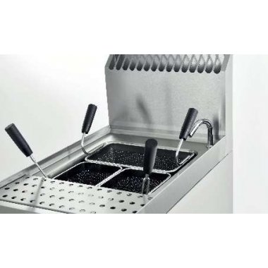 Características Técnicas • Sistema de control intuitivo, con mandos ergonómicos. • Sistema de protección del dispositivo accesible desde el panel de control. • Generador de chispa con alimentación 230V. • Válvula de llenado de agua. • Orificio de desborde y salida de drenaje de agua. • Se suministra sin cestas. • Posibilidad de utilizar cestas GN1/3 y/o 2xGN1/6. • Patas ajustables (45 mm). • Se...