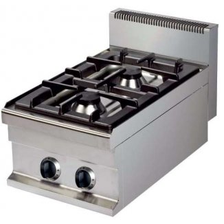 Características Técnicas • Estructura construida en acero inoxidable. • Plano de trabajo, paneles laterales, paneles de mandos, y chimeneas en acero inoxidable. • Bandejas recoge-grasas en acero inoxidable. • Quemador con válvula de seguridad y termopar. • Parrillas robustas de hierro fundido que permiten acomodar cazuelas de grandes dimensiones. • Bandejas recoge-grasas que cubren todo el área...