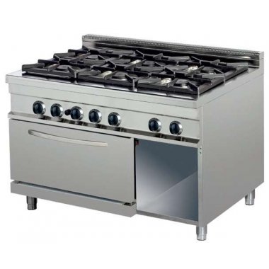 Características Técnicas • Estructura construida en acero inoxidable. • Plano de trabajo, paneles laterales, paneles de mandos, chimeneas y puerta de horno en acero inoxidable AISI-304 • Bandejas recogegrasas en acero inoxidable. • Quemadores alta potencia de doble corona en latón, totalmente equipados con termopar de seguridad. • Parrillas robustas de hierro fundido que permiten acomodar...